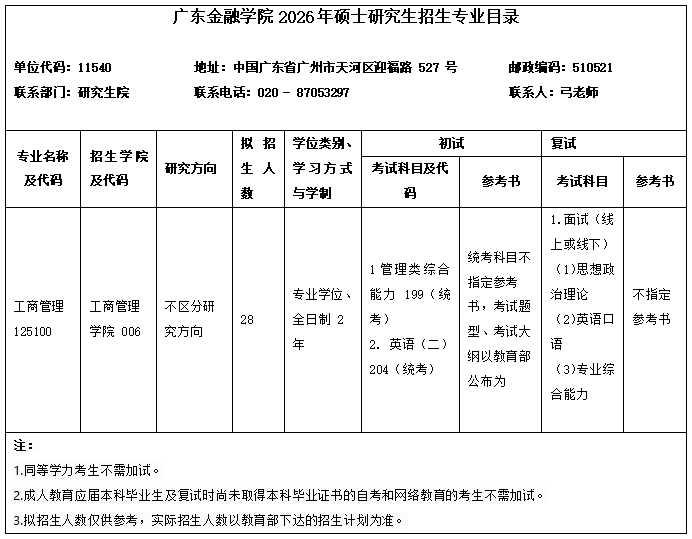 地址:广东省广州市天河区迎福路527号广东金融学院研究生院招生办